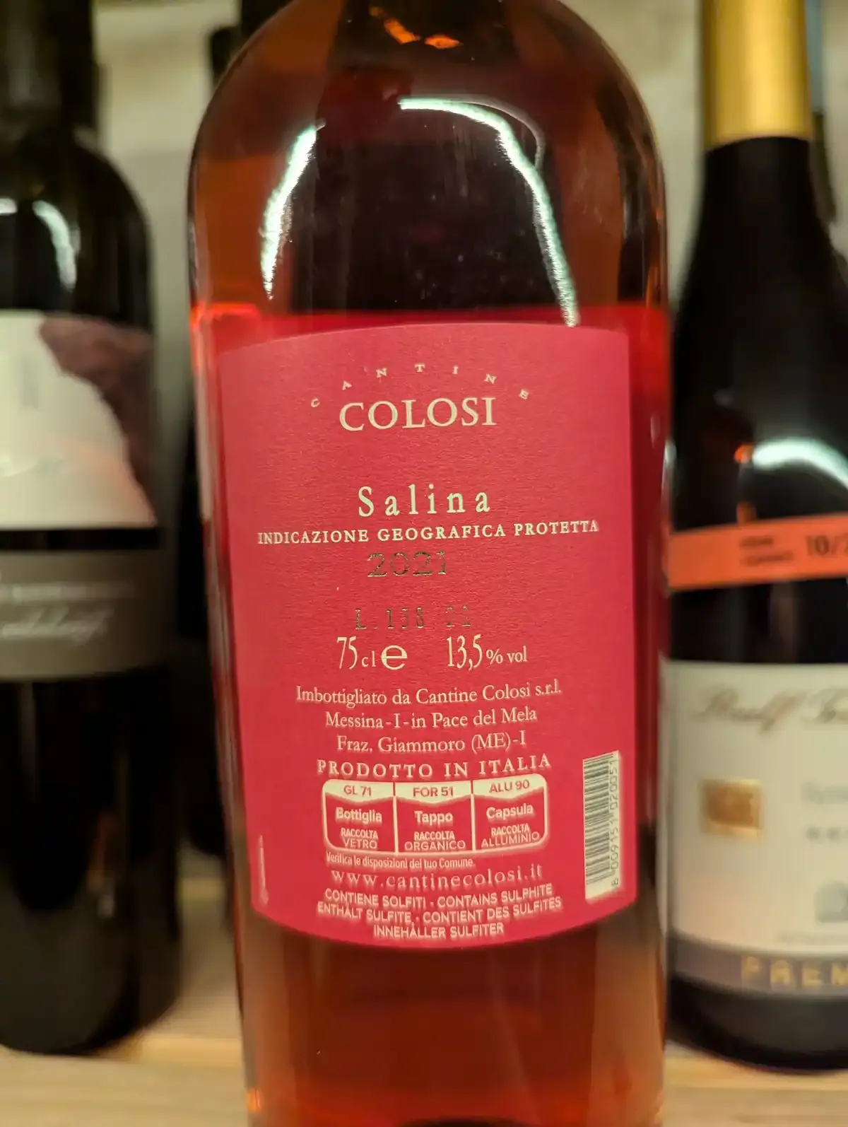 Der Roséwein Salina Rosato Terre Siciliane IGT, Jahrgang 2021 des Weinguts Cantine Colosi wurde 2022 von Othmar Kiem, Simon Staffler mit 88 Falstaff-Punkten bewertet. Es handelt sich um einen Wein der Rebsorten Nerello Mascalese, Corinto nero aus der Region Sizilien in Italien.